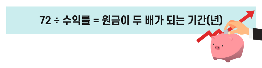 연 8%의 수익률을 내면서 복리로 투자한다면, 우리는 72 ÷ 8 = 9년 만에 원금을 두 배로 불릴 수 있죠.