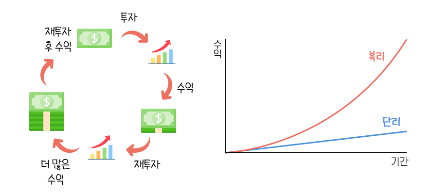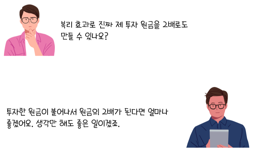 이게 이자가 아니라 투자의 수익금이어도 똑같은 효과를 볼 수 있어요. 주식이나 펀드에서 배당금이나 수익이 생겨도 빼지 않고 다시 투자에 넣으면, 다음에는 (원금 + 수익)으로 더 많은 금액이 투자되는 거거든요.