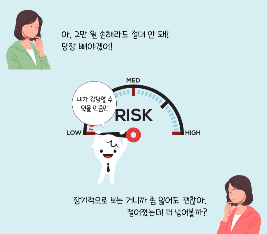 '절대 손해를 볼 수 없다'고 생각했다면 안정형이에요. '만약에 떨어진 김에 더 투자하겠다'고 나선다면 적극형이라고 할 수 있죠. '아깝지만 더 지켜보지 뭐…'라고 한다면 중도형이라고 볼 수 있겠네요.