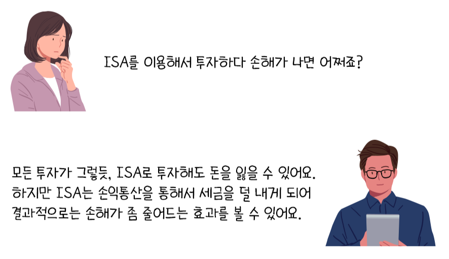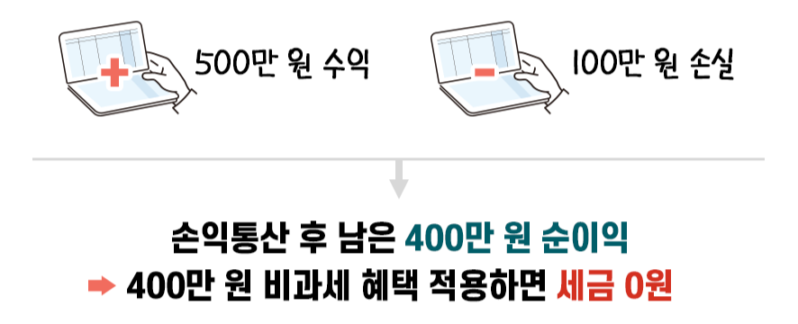만약에 ISA를 이용한 한 상품에는 500만 원을 벌었는데, 또 다른 상품에서는 100만 원 손해를 봤다고 해 볼게요. 이럴 때는 일반 계좌라면 수익이 난 계좌(500만 원)에 대해서 세금을 부과해요. 하지만 ISA에서 투자한 경우라면, 500만 원(수익) – 100만 원(손실)을 뺀 400만 원에 대해서만 세금을 부과하게 됩니다.