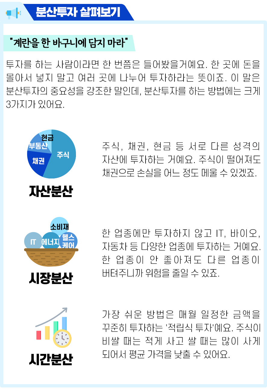 위험을 줄이는 방법은 여러 가지 방법이 있는데, 펀드나 ETF를 이용해 다양한 투자 대상에 투자하는 방법도 있고, 시간을 들여 조금씩 투자금을 분산하는 방법도 있어요. 매월 일정 금액씩 꾸준히 투자하는 적립식 투자처럼 말이죠.