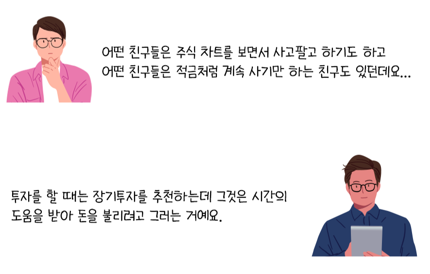 투자를 짧은 호흡으로 바라보고 1년 안에 결과를 보고 싶을 수도 있고, '한동안 쓸 일이 없으니까 5년 동안은 계속 두고 볼 거야.'라고 생각하는 사람의 투자 스타일은 달라질 거니까요. 단기와 장기는 완전히 다른 투자 전략이 필요하거든요.