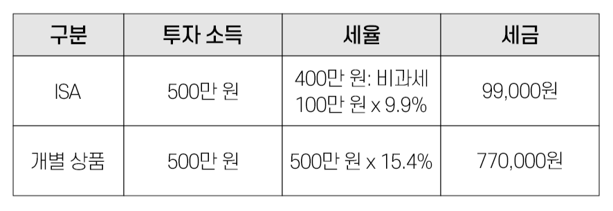 개별 상품을 통해 투자하여 500만 원을 벌었다면 세금은 500만 원 x 15.4%를 해서 총 77만 원의 세금을 내야 했겠지만, ISA에서 투자한 경우는 순이익을 100만 원으로 보고 100만 원 x 9.9% = 9만 9,000원만 내면 되는 거예요.