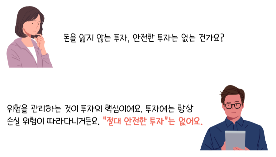 ③ 하지만 이 위험을 아예 피할 수는 없으니까, 최소화하고 관리하는 방법을 배워야 해요. 예를 들어 한 곳에 모든 돈을 몰아넣지 않고 여러 곳에 나누어 투자하는 것도 위험 관리 방법 중 하나예요.