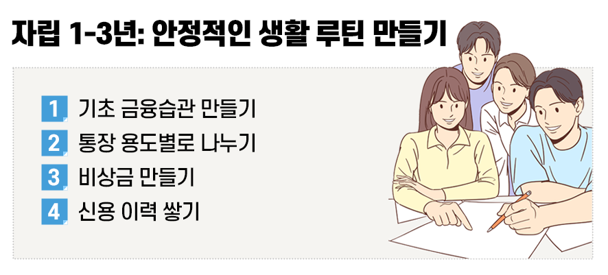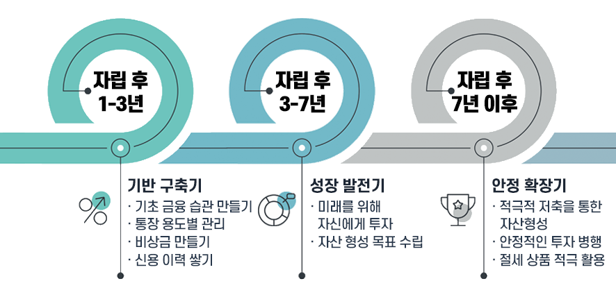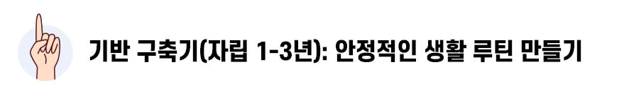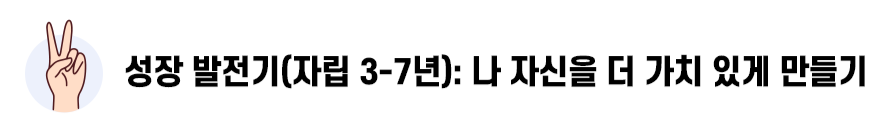 자립하고 나서 5년이 정말 중요한 골든타임이에요. 특히 처음 1~3년은 '안정적으로 살아남기'가 가장 우선이죠. 살아남기라고 하니까 좀 무겁게 들릴 수 있지만, 쉽게 말해서 나만의 안정적인 생활 패턴을 만드는 시기라고 생각하면 돼요. 자립 3~7년 후는 자신의 발전을 위해서 노력하는 성장발전기이고, 7년 이후는 안정적인 자립을 위한 안정 확장기라고 할 수 있죠.