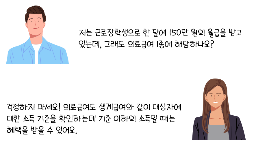 그래서 150만 원의 월소득이 있어도 의료급여 1종 기준액 956,805원에는 미치지 못하기 때문에 의료비 걱정 없이 치료받을 수 있습니다.