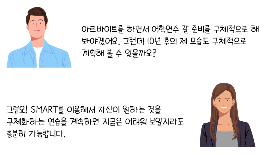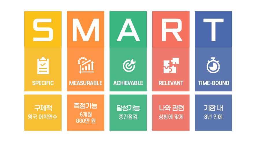 그리고 꼭 시한을 명시하세요. '3년 안에'와 같이 목표 시한을 정해 놓으면 그 기간 내에 목표를 달성하기 위해 더 노력할 수 있습니다. 여기서 중요한 것은 중간 점검을 언제 할지도 함께 설정하는 것입니다. 3년 목표라면 1년마다 점검일을 정해서 계획을 수정·보완한다면 목표 달성 가능성이 훨씬 높아집니다. 이렇게 목표를 구체화하는 것을 SMART 법이라고 부릅니다.