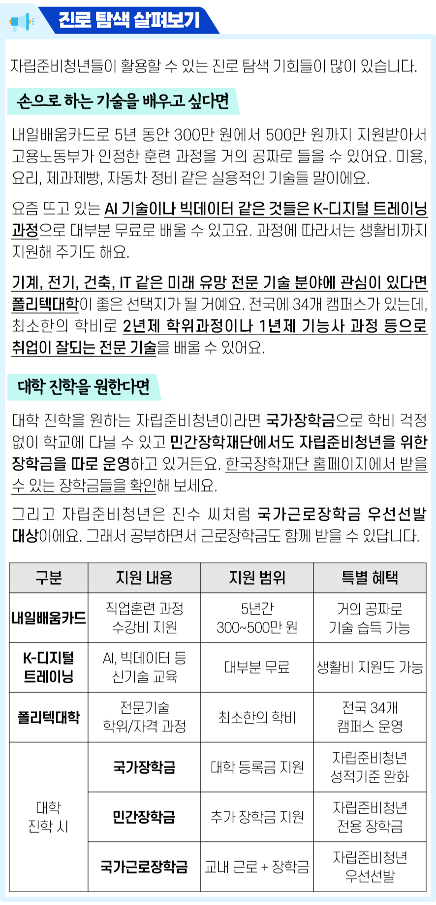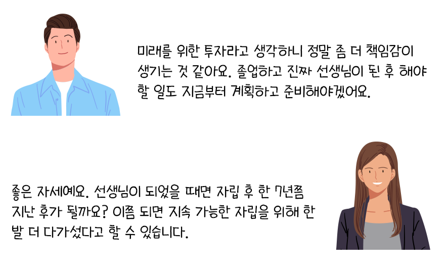 진수 씨는 근로장학생과 자립수당, 그리고 학업을 통해 본인의 생활 루틴을 잘 만들고 어학연수라는 목표를 위해 알뜰하게 살겠다고 다짐한 거잖아요. 이렇게 자립 3~7년 사이에는 자신의 발전을 위해 노력하는 시기입니다.