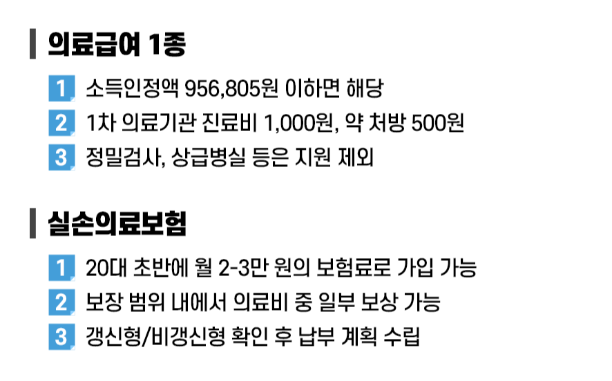 20대 초반에 실손의료보험에 가입하면 월 2~3만원의 보험료로 보험에 가입할 수 있어요. 건강하고 어릴 때 가입해 두면 나중에 월급이 올라 의료급여 혜택을 받지 못하는 경우에도 보험을 통해 의료비 일부를 돌려받을 수 있으니 예상치 못한 의료비 지출을 막을 수 있겠죠?