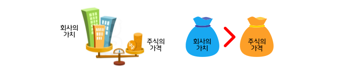 내재가치는 기업이 현재 가지고 있는 자산의 가치와 미래에 벌어들일 수익의 가치를 합한 것입니다. 자산, 수익 및 배당금 등을 분석해서 내재가치를 구한 다음 시장 가격과 비교하여 시장가치(주가)가 내재가치보다 저렴하면 주식은 저평가된 것으로 간주됩니다.