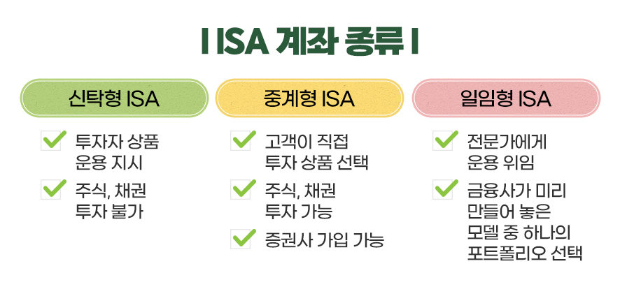 또 금융회사가 세금 신고를 다 대신해 준다는 장점이 있죠. 예금, 적금도 할 수 있는 ISA라 신탁형은 은행에서도 만들 수 있어요. "일단 안전하게 시작하고 싶어."하는 사람에게 추천해요. 나중에 익숙해지면 펀드 비중을 늘릴 수도 있고요.