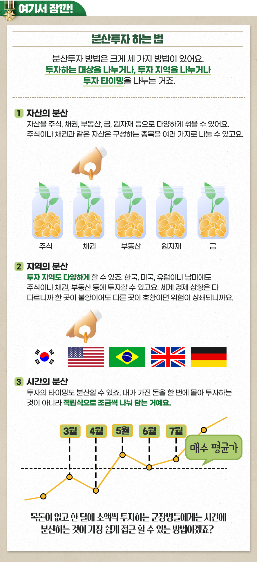 그런데 이렇게 자산도 분산하고, 지역도 분산하고, 시간도 분산해야 하는 건 알고 있다고 하더라도, 군 복무 중에 이걸 다 따져가면서 투자하기는 쉽지 않죠.